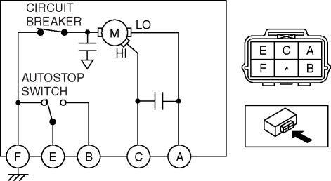 4. Connect wiper motor terminals E and A, and apply battery positive voltage to terminal B.