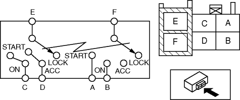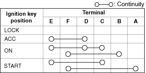 1. Verify that the continuity between the ignition switch terminals is as indicated in the table. If not as indicated in the table, replace the ignition switch.
